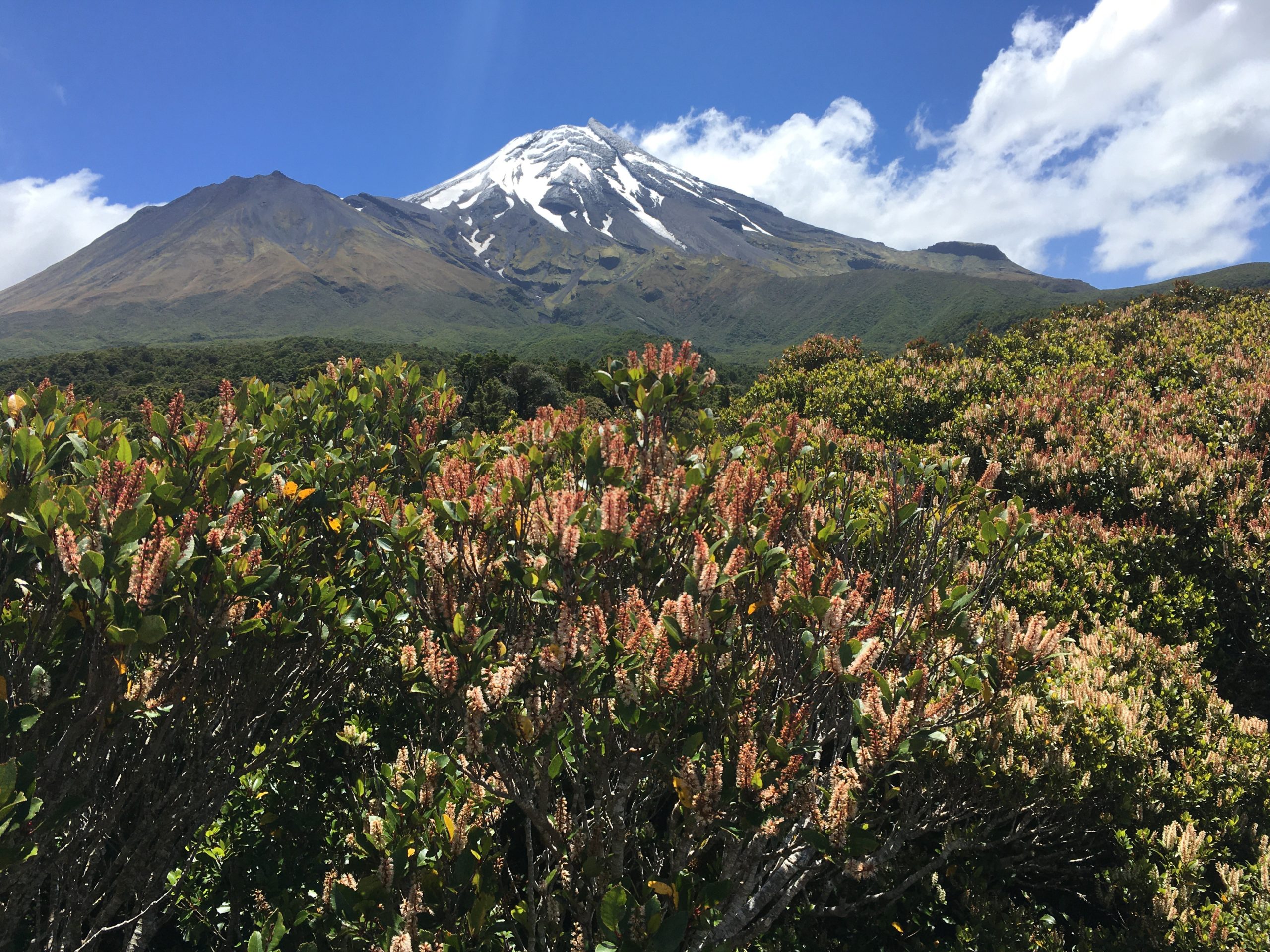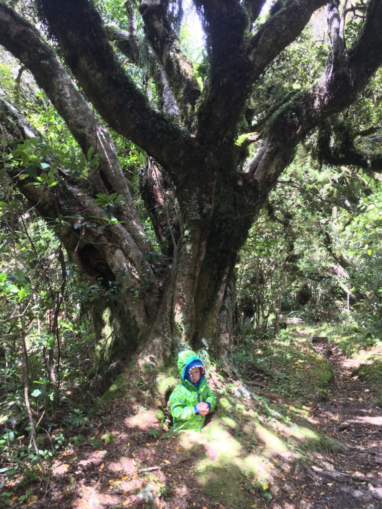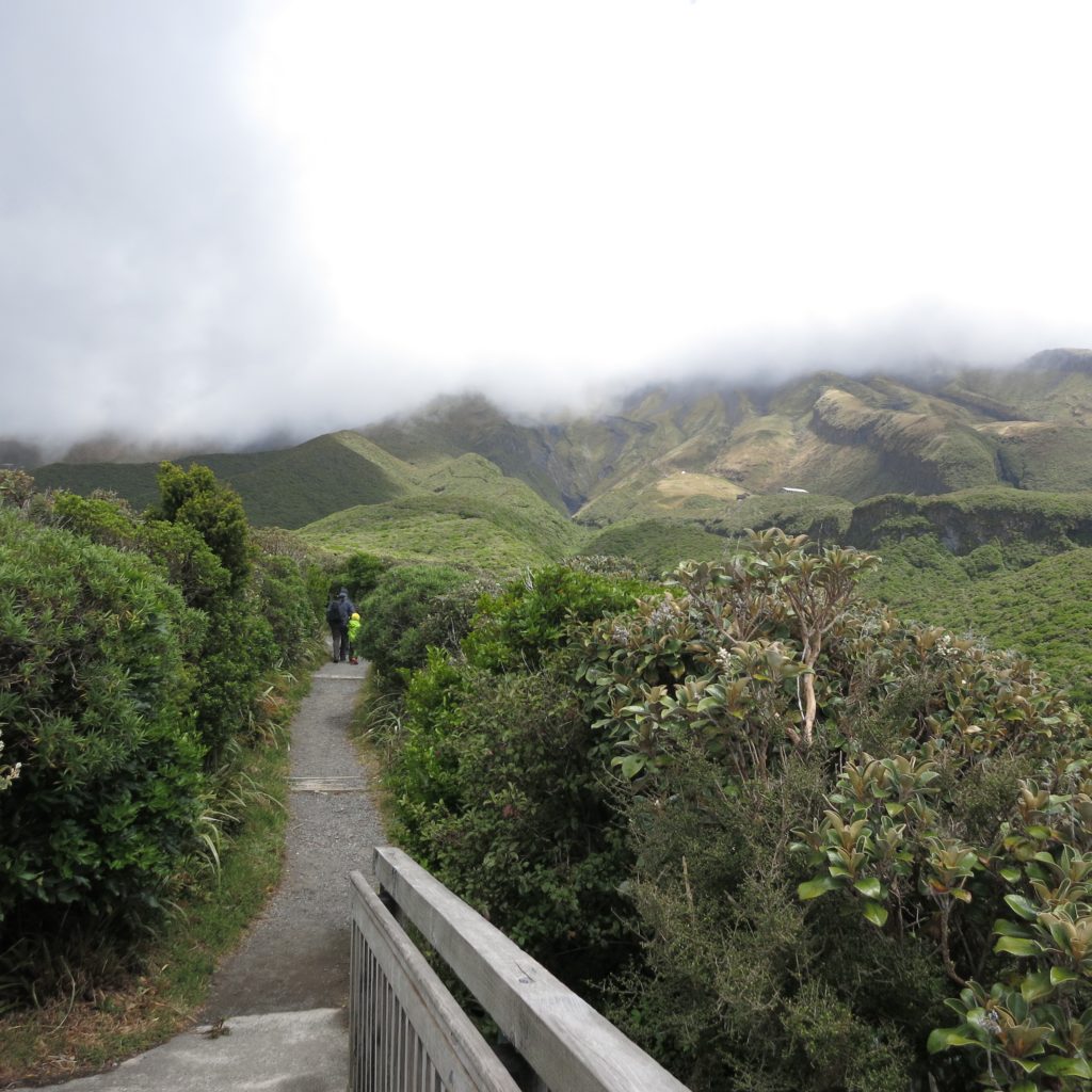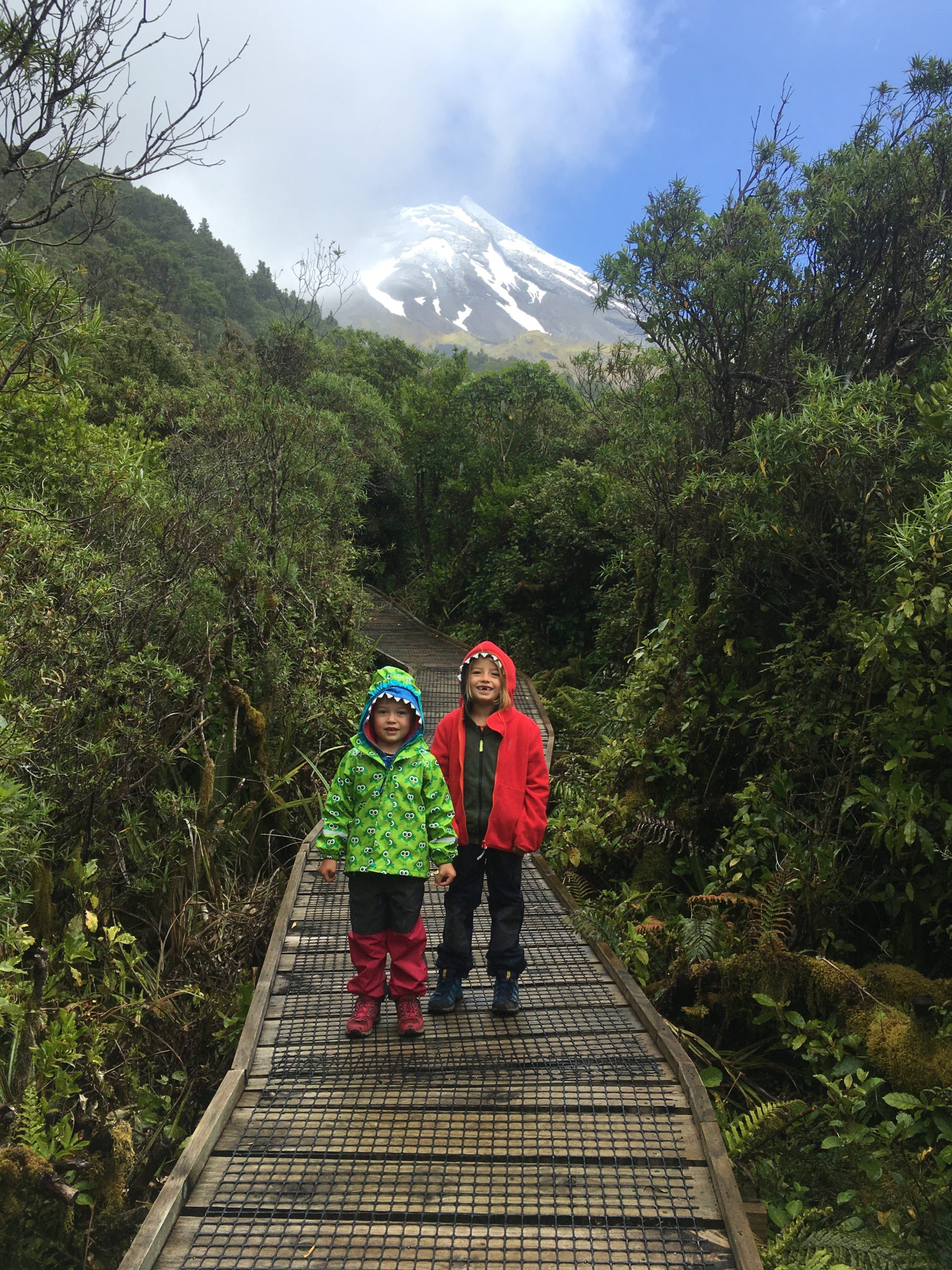 #3: Mount Taranaki – unser zweiter Vulkanversuch nach Rangitoto Island in Auckland. Wanderalarm bei Sauwetter, aber das Wandern ist des Müllers Lust und hier in Neuseeland geht das halt so gut, auch wenn es uns fast von der Aussichtsplattform weht und immer mal wieder ein fieser Regenschauer über uns hinwegfegt. Die Wanderwege führen zum Glück vor allem durch mannshohes Gebüsch, so dass der Wind nicht mehr ganz so schlimm ist. Außerdem gibt es ja die Sache mit dem Wetter und der Kleidung, wie auf dem Foto unschwer zu erkennen ist…