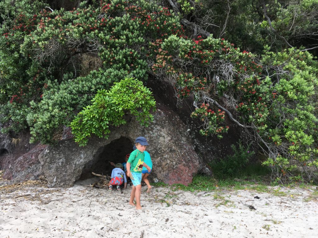 Zum New Chums Beach kommt man nur zu Fuß bei Ebbe oder mit dem Boot. Da wir zu sechst nicht wirklich gut ins Boot passen und es außerdem nicht so heiß ist, entscheiden wir uns am nächsten Morgen, sehr zum Entsetzen der Kinder, zu laufen. Eigentlich ein schöner nicht allzu langer Weg durch einen kleinen Fluß, über Felsen am Strand entlang und dann ein kurzes Stück durch ein Wäldchen, dazu auf dem Weg jede Menge interessantes Treibgut, Stöcke und alles was ein kreatives Kinderherz so begehrt. Ist aber mal wieder voll langweilig und total doof – damit sind sie sich diesmal alle (!) Kinder einig. Egal. Mir gefällt es.