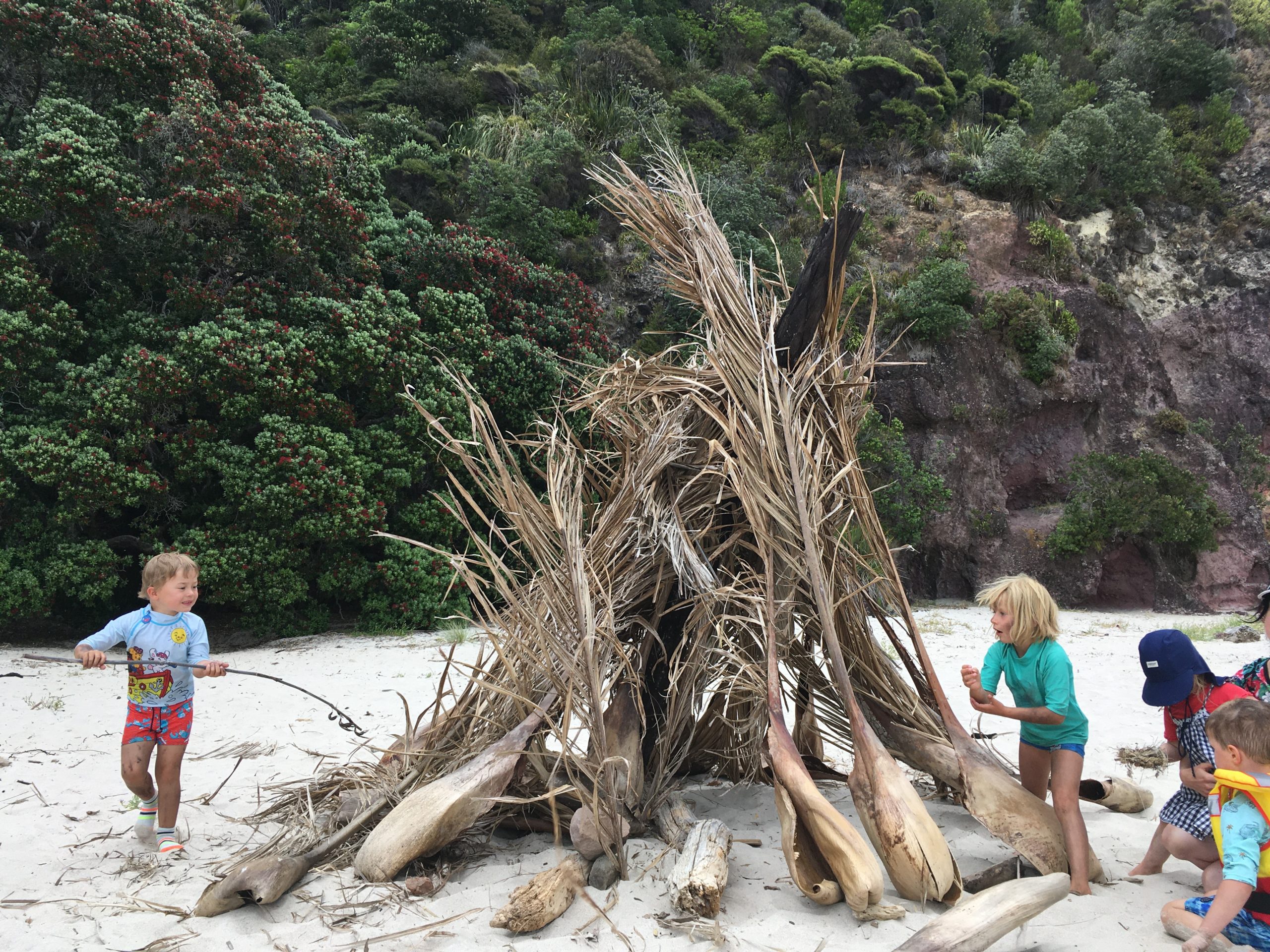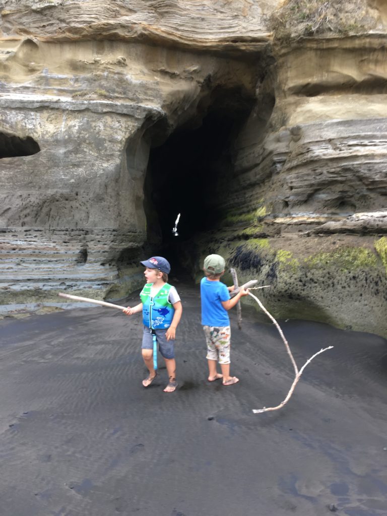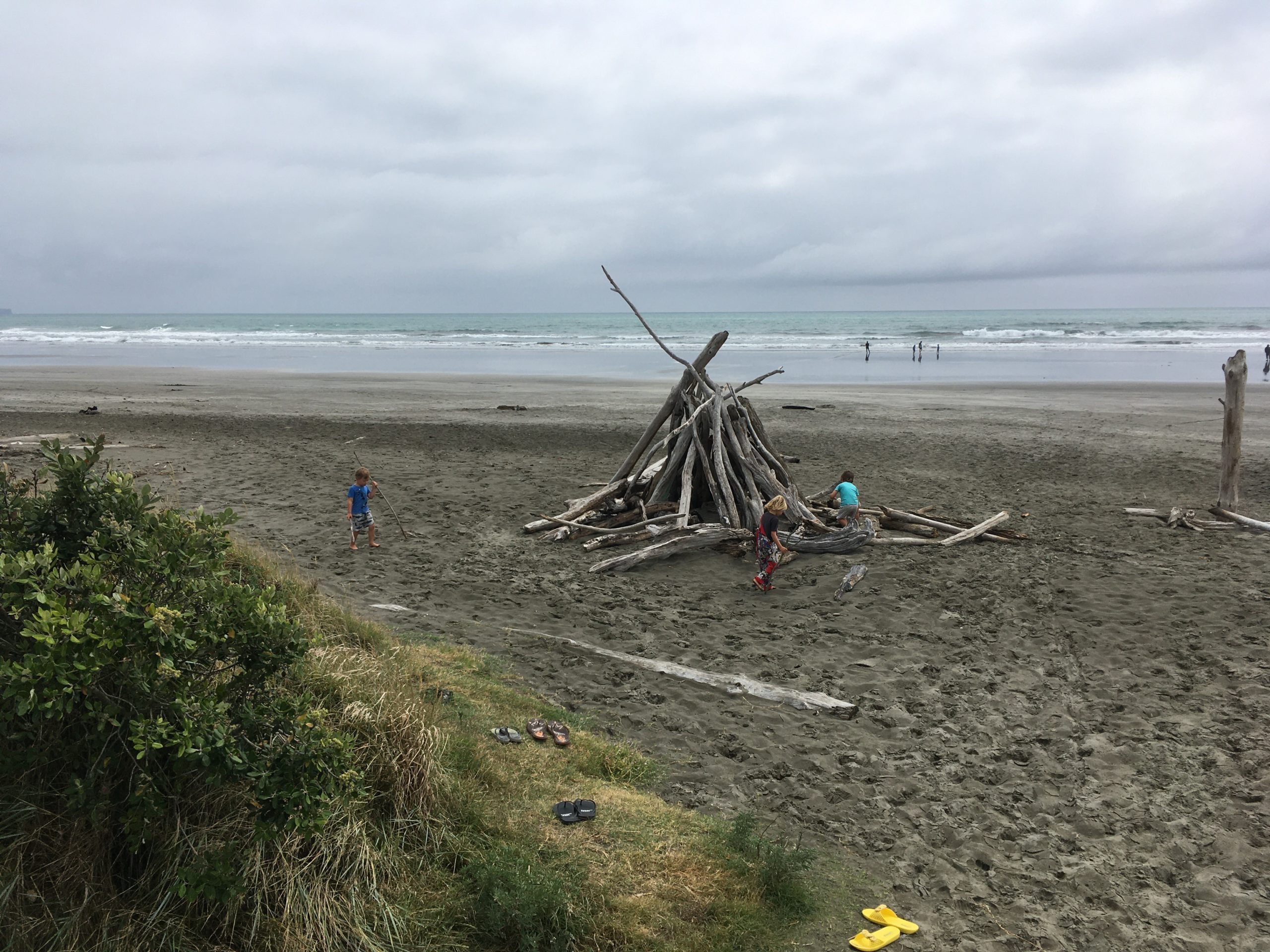 Kaum angekommen, sind binnen weniger Minuten alle Kinder weg. Unzählige kleine Höhlen, bunte Felsen, Bäume, die mit ihren Blätterdächern in den Strand hineinragen und die Reste von anderen Strandbauten lassen die Kinderherzen höher schlagen. Es ist eh kein Badewetter, also wird eifrig gebaut, Stöcke werden aufgetürmt und alle möglichen Ausrüstungsgegenstände werden in der Räuberhöhle verstaut. Wir treffen außerdem die Nachbarsfamilie mit Zwillingen vom Campingplatz in Cooks Beach, die uns noch netterweise ihren Vorgarten bei Wellington als Übernachtungsplatz anbietet. Hervorragend! So macht Freedom Camping Laune.