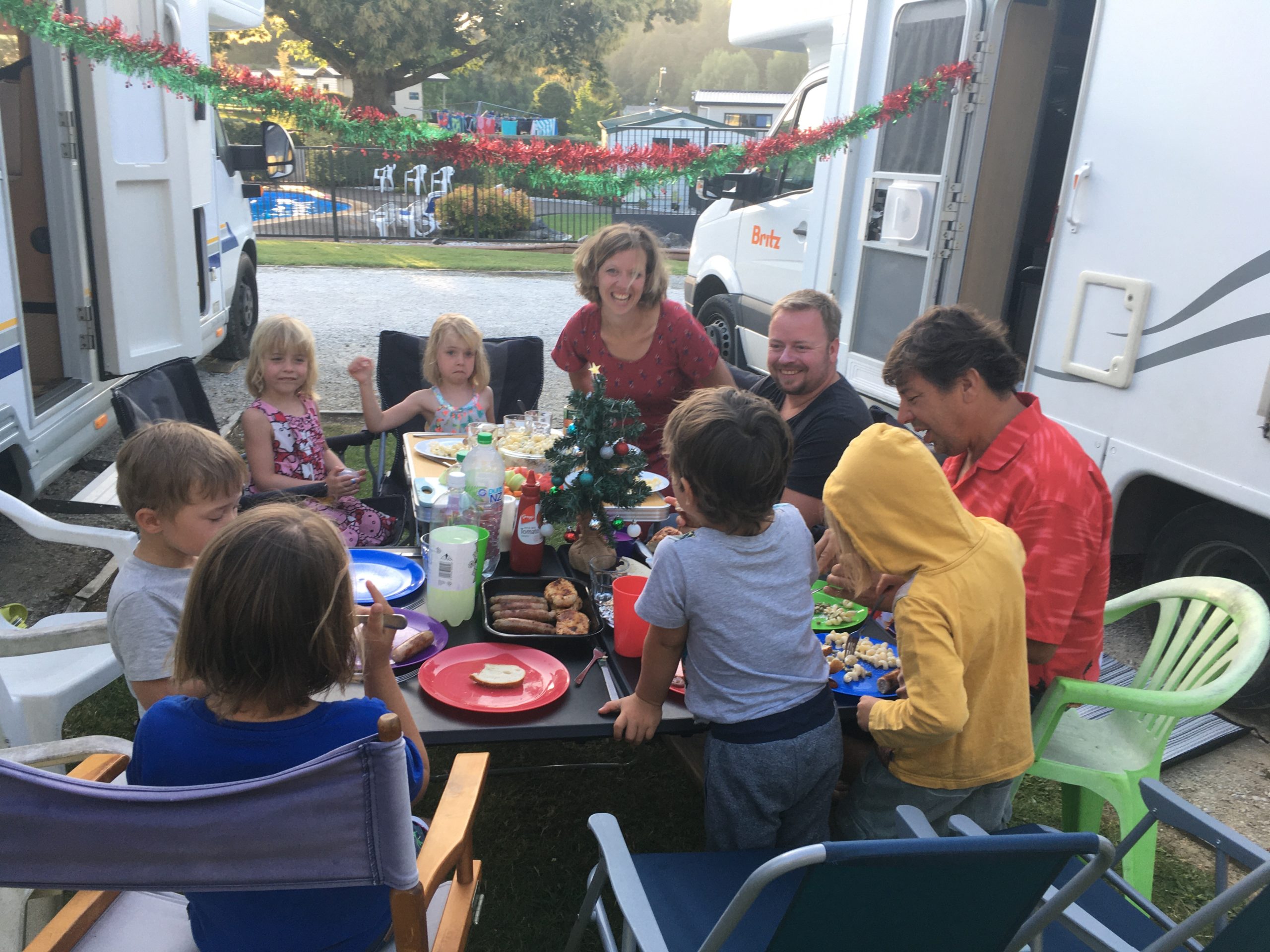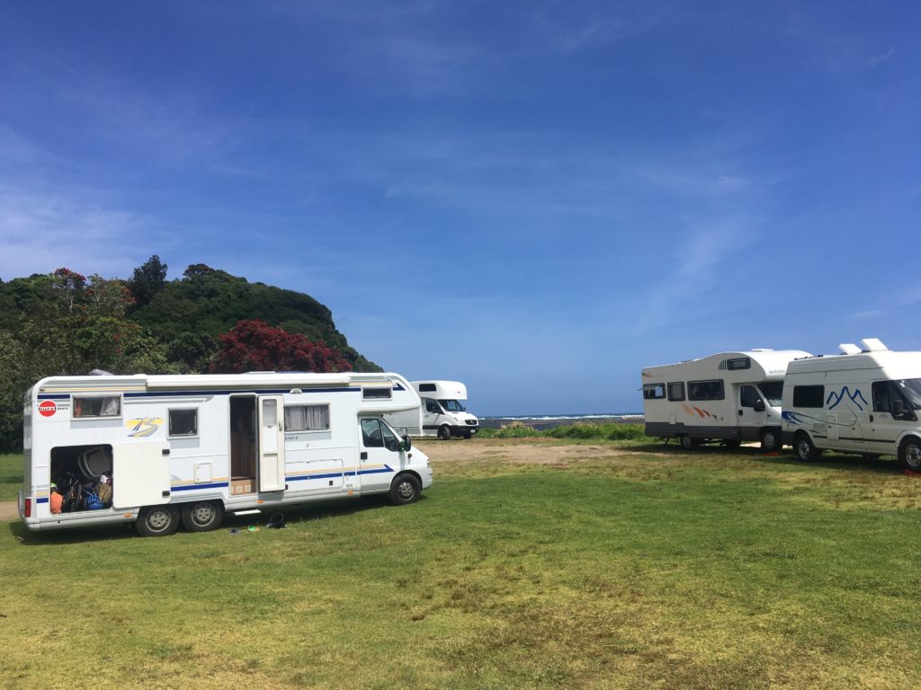 …das während unseres Aufenthalts eine unglaubliche Veränderung durchmacht. Wir kommen am 22.12. am Camping-Platz an, der bis auf ein paar versprengte Campervans und vereinzelte Zelte menschenleer ist. Wir haben einen Stellplatz in der Nähe eines kleinen Bachlaufs, abseits von allem. Angeblich ist nach Weihnachten alles voll und wir können nirgendwo sonst hin. Etwas unbefriedigend, zumal der Wasserlauf Mücken befürchten lässt (was mich zwar nicht so juckt (haha…), aber Ingo und die Kinder umso mehr). Tatsächlich sind wir bei Dämmerung fünf Minuten zu lange mit kurzen Hosen draußen und Carlottas und Benjamins Beine werden übel zerstochen. Ein Grund mehr am nächsten Tag noch einmal einen Platzwechsel anzufragen, was dann auch problemlos klappt. Weg vom Bach, näher am Pool, Spielplatz etc. – ist auch alles noch nichts los. Nichtstdestotrotz wird es jeden Tag ein wenig voller und spätestens am 26sten gleicht das Ganze einer kleinen Zeltstadt. Dazu muss angemerkt werden, dass die Newzies sehr “professionell” campen: Sie kommen entweder mit großen Wohnwägen oder Campervans mit riesigen Vorzelten oder noch besser, mit unglaublich großen Familienzelten und Pavillons, die mit Kühlschrank, Kochzeile, BBQ, Fernseher, Sitzsäcken und all möglichen anderen Komfort ausgestattet sind. Außerdem haben sie natürlich noch diverse (Wasser-) Sportgeräte dabei, im einfachsten Fall Bodyboards, in der Regel aber außerdem Surfbretter, Kajaks, Motorboote, Jetskis, Fahrräder und so weiter. Irre. Ein Tag Aufbau, ein Tag Abbau… Zum Glück geht das bei uns ein wenig schneller (auch wenn wir den Checkout um 10:00 Uhr normalerweise nicht pünktlich schaffen – liegt aber eher am späten Frühstück…). Wir brechen unsere Zelte ab, als der Campingwahnsinn seinen Höhepunkt erreicht hat und fahren noch ein wenig Richtung Norden, Richtung New Chums Beach, der angeblich zu den zehn schönsten Stränden der Welt gehören soll. Wir steuern einen Freedom Camping Spot an, der aber schon besetzt ist, als wir dort ankommen. Wir sind einfach zu spät dran. Während wir überlegen, ob wir eine Strafe riskieren sollen, macht Ingo die Bekanntschaft von Ian, der sich für das Kraupa-Mobil interessiert und uns kurzerhand anbietet, bei im Vorgarten seines Ferienhauses für die Nacht zu parken. Problem gelöst.