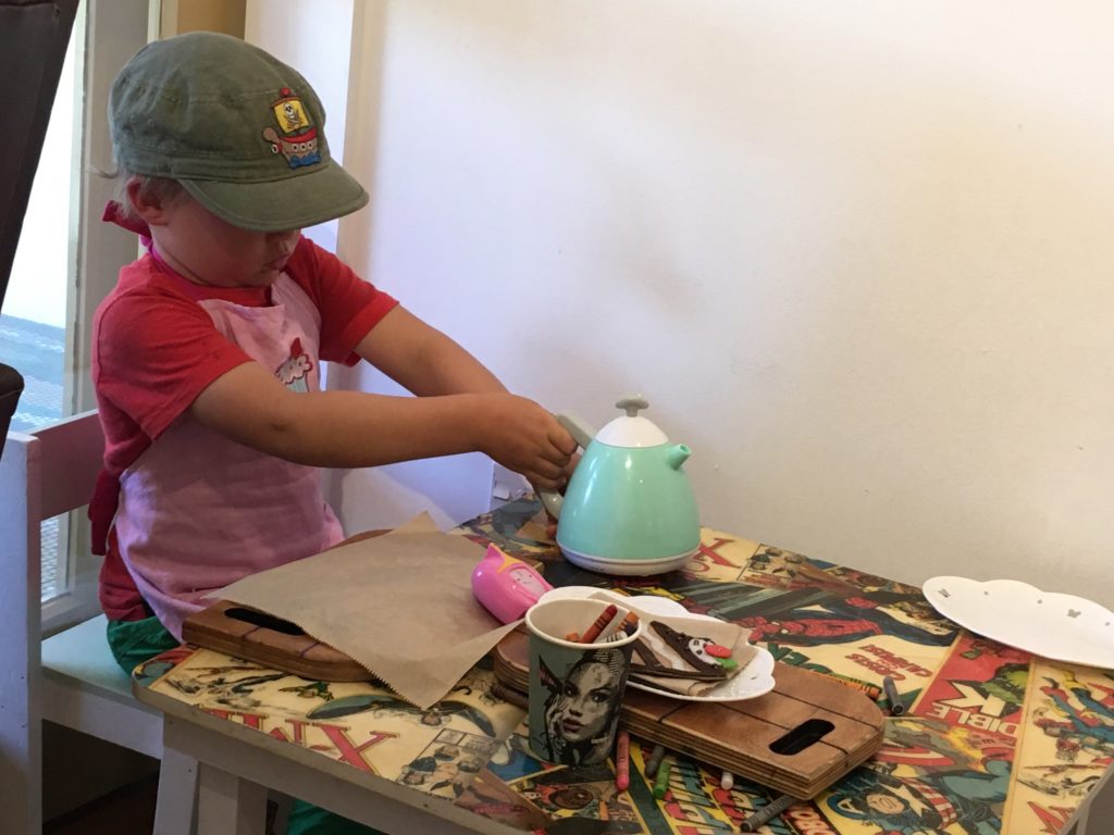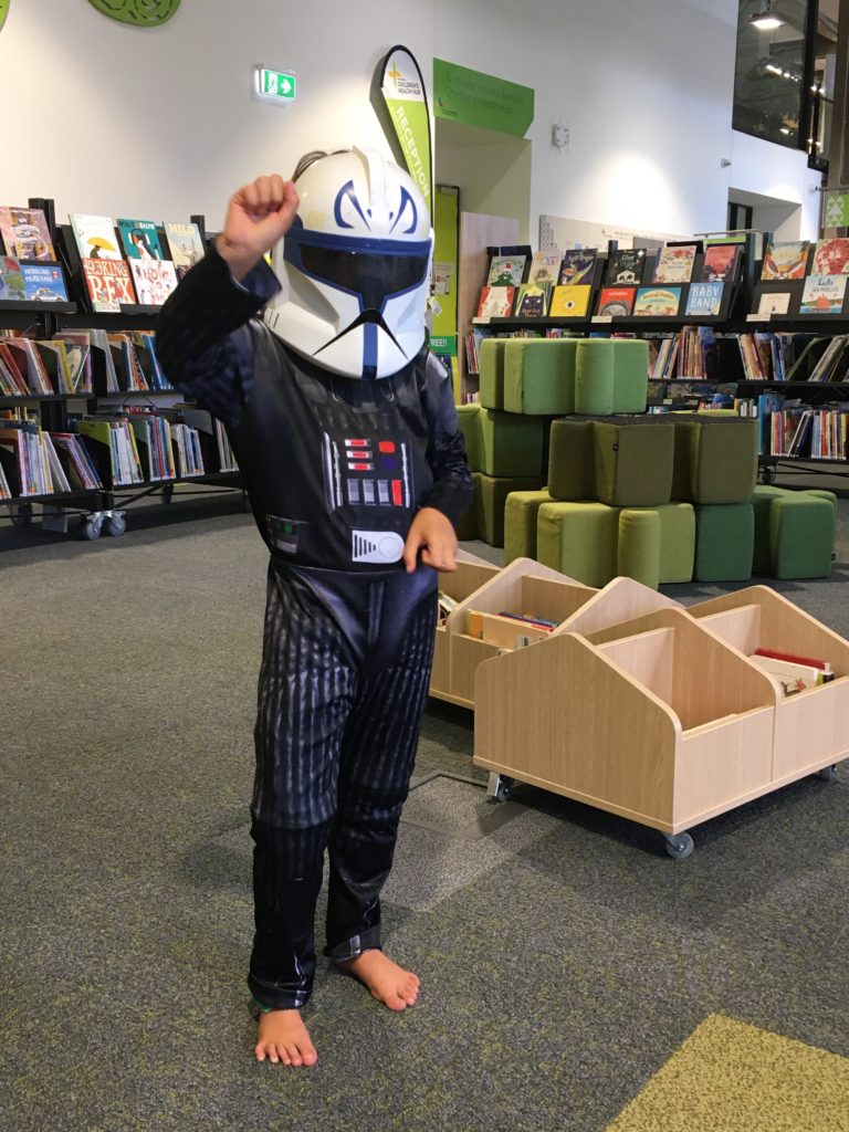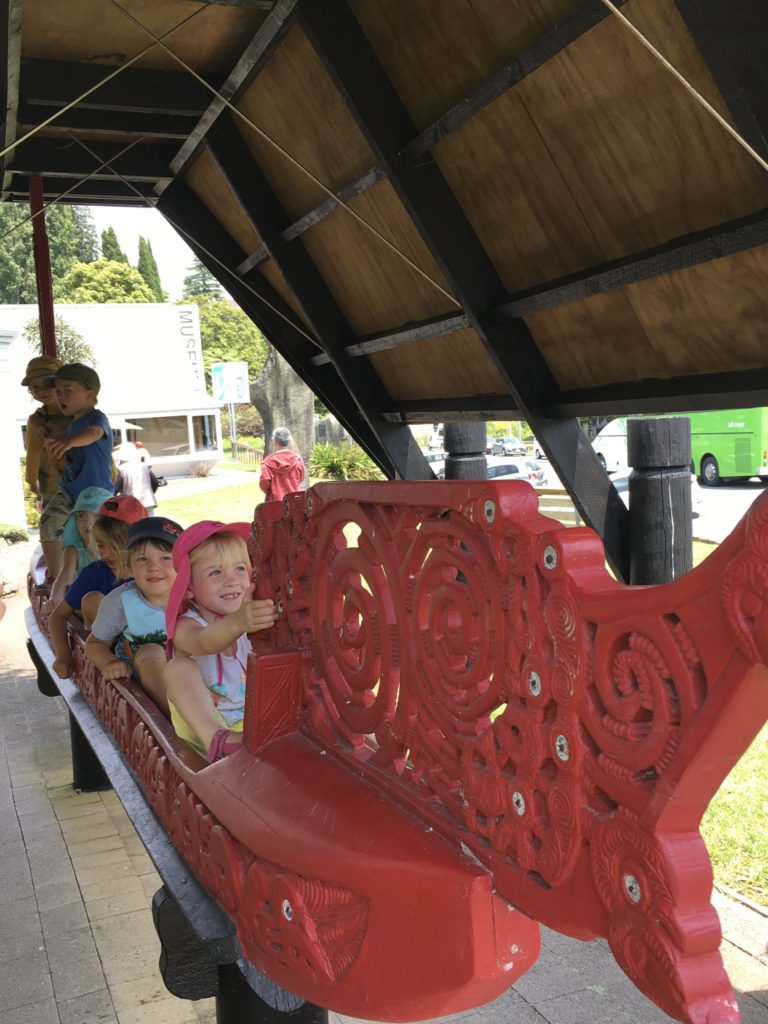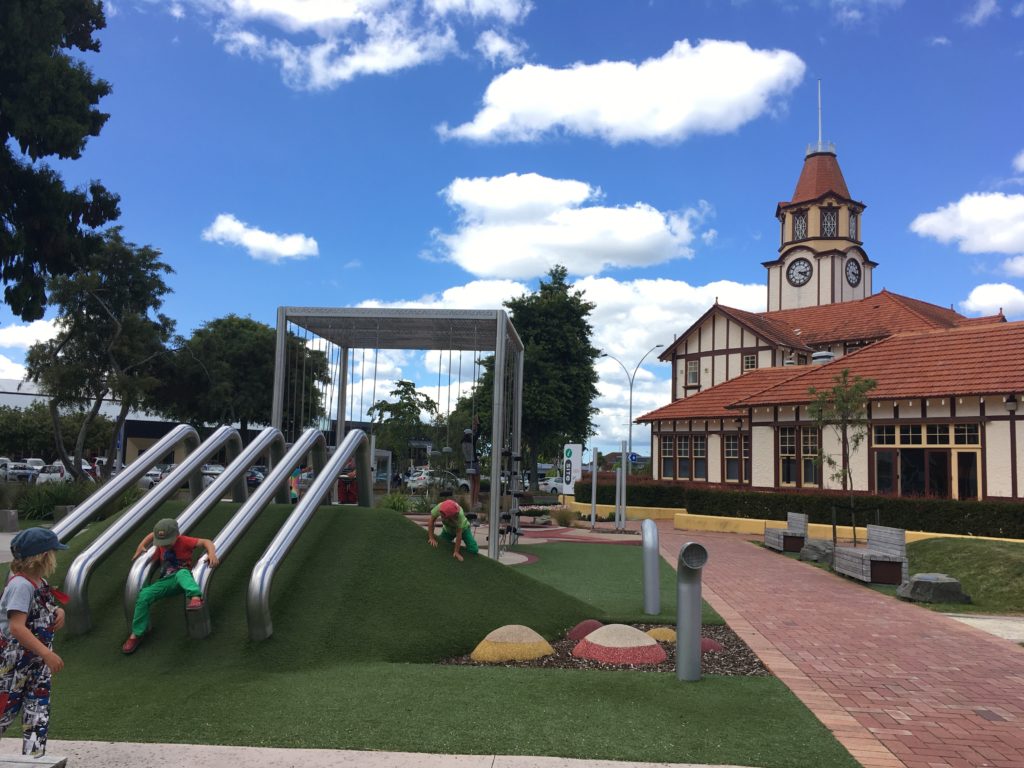 Dann geht es weiter in das Herz des Hexenkessels, nach Rotorua. Die ganze Stadt stinkt nach faulen Eiern und besteht aus tausenden Hotels mit Thermalpools und Spas. Überall dampft und brodelt es. Wir stellen uns auf einen Freedom Camping-Platz gleich neben einem Blubberpool mit entsprechender Duftnote. Großes Protest-Geschrei setzt ein, keiner möchte das Wohnmobil verlassen. Wir ignorieren das Geschrei und komplementieren die Kinder nach draußen, schließlich wird der Gestank vom im Wohnmobil sitzen auch nicht besser. Zum Glück ist gleich ums Eck ein Art Centre mit kleinem Café, Malsachen, einer Kinderspielecke und einer alten Schreibmaschine, cool! Auf einmal ist es dann doch nicht so schlimm… Wir erkunden die “Stinkestadt” und entdecken bei der Touristeninfo einen Spielplatz, der eher wie moderne Kunst aussieht. Außerdem stellen wir fest, dass es in der öffentlichen Bücherei gleich daneben eine Kinderlese-Ecke mit Verkleidungskiste gibt. Möge die Macht mit dir sein..