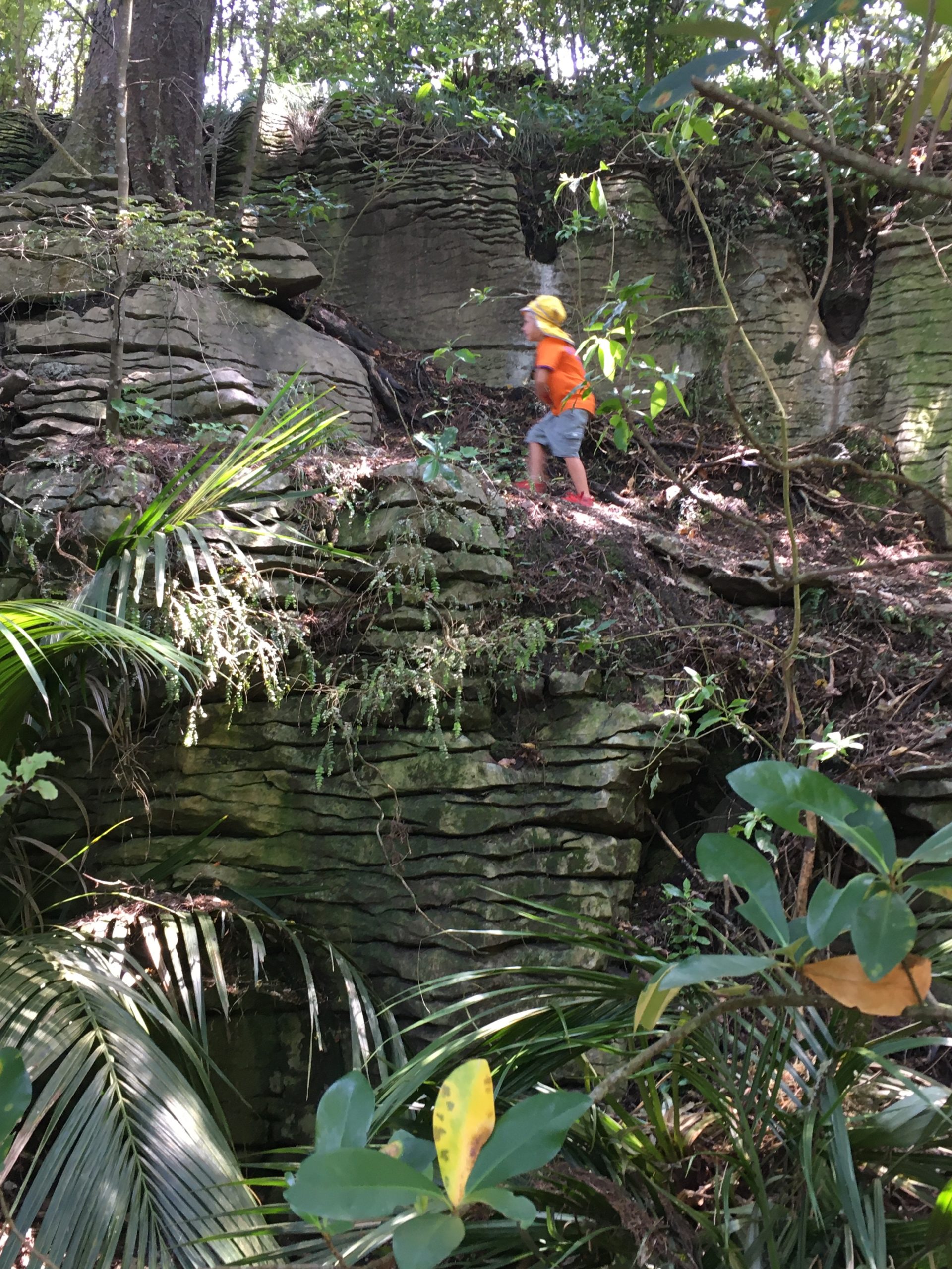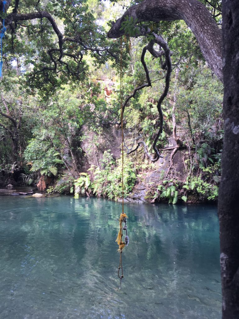 Nachdem die Wasserfälle (trotz schlechtem Schuhwerks, eieiei, wer hat denn da die Crocs erlaubt…) in etwa einer knappen Dreiviertelstunde erreicht sind, beschließen wir noch ein wenig zu einem Swimming Hole weiterzugehen. Das zieht auch bei den Kindern (Wasser, Fernsehen, Eis und Schokolade… 😉 )