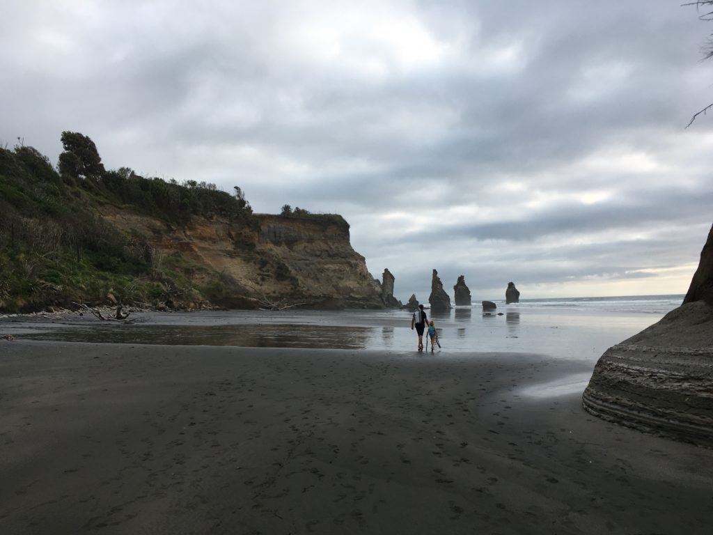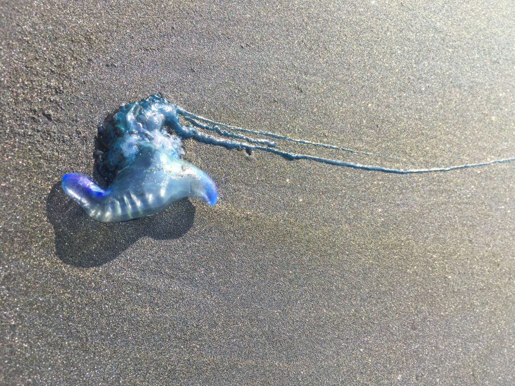 Zufällig entdecken wir einen schönen Freedom Camping Spot direkt neben dem Parkplatz beim Zugang zum Strandwanderweg zu den Three Sisters, bei denen vor einigen Jahren ein großer Felsbrocken abgebrochen ist, so dass es jetzt passenderweise eher vier “Sisters” sind. Trockenen Fußes erreicht man sie nur zwei Stunden vor oder nach Ebbe, deswegen bricht Ingo schon mal mit Moritz mit im Kanu auf, während alle anderen noch Sand spielen und auf die Ebbe warten. Wir kommen bei Niedrigwasser nach und sind ob der Kulisse beeindruckt (die Kinder vor allem auch wieder wegen der Tonnen an Treibholzstöcken). Leider gibt es auch jede Menge angespühlte, bläuliche Quallentiere, die verdächtig nach der portugiesischen Galeere aussehen.Wir bewegen uns in respektvollem Slalom um die Tiere mit ihren giftigen Tentakeln herum…