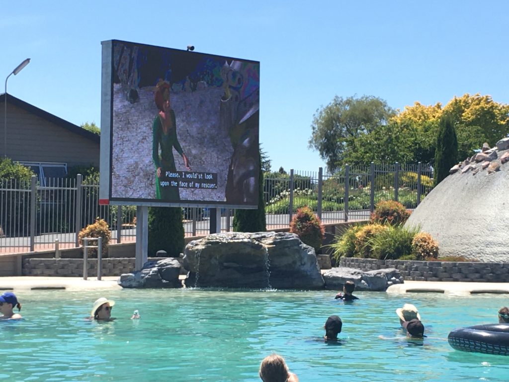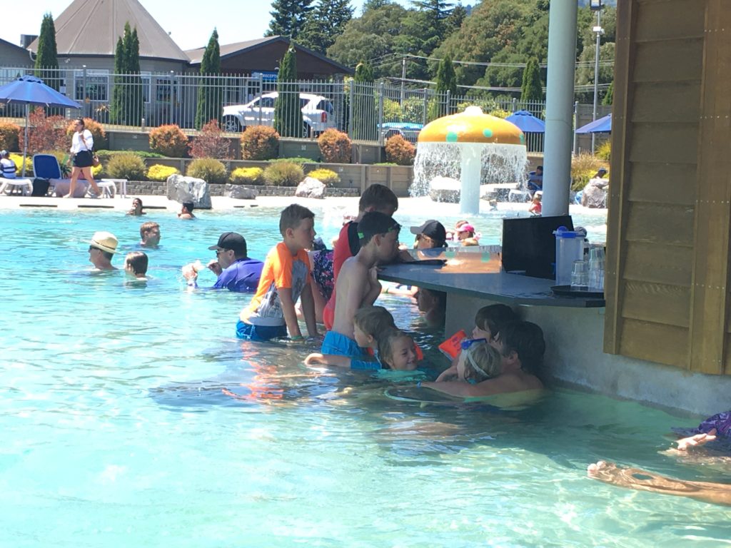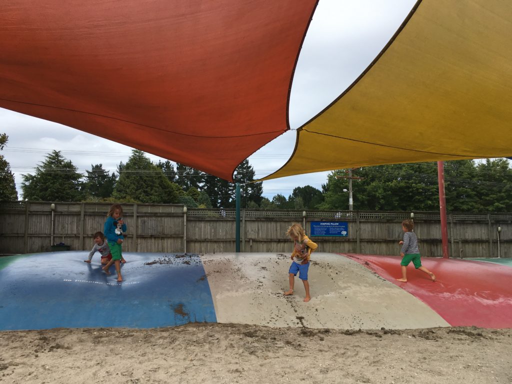 Inzwischen sind wir im Zentrum der Nordinsel angekommen und da dampft, brodelt und stinkt es vielerorts – geothermal activities heißt das hier. Heiße Quellen und Thermalbäder an allen Ecken und Enden. Wir beginnen in Taupo, ein ziemlich touristischer Ort und beginnen mit “Urlaub vom Urlaub”. Wir landen auf einem Campingplatz mit riesigen Pool (endlich mal einer, der seinen Namen auch verdient) mit Swim-up Poolbar (was Ingo besonders entzückt) und einer riesigen Leinwand, auf der zweimal täglich Familienkino läuft (was die Kinder sehr entzückt). Das Wasser ist angenehm warm und müffelt zum Glück nicht. Außerdem gibt es noch zwei weitere, kleinere Pools, einen Spielplatz, zwei riesige Hüpfkissen, Outdoor-Schach und Dame, einen Fahrrad-Hindernis-Parkour, Waschmaschinen mit Heißwaschprogramm (was la mama freut 😉 ) schlicht weg alles, was das Camper-Herz begehrt.