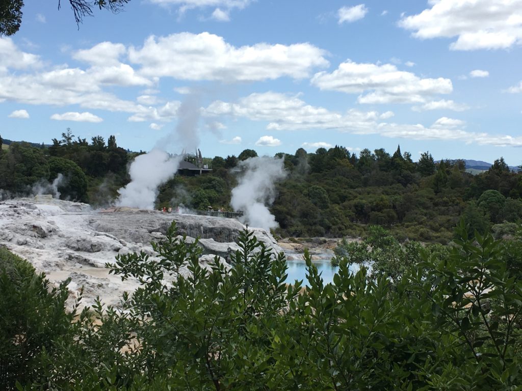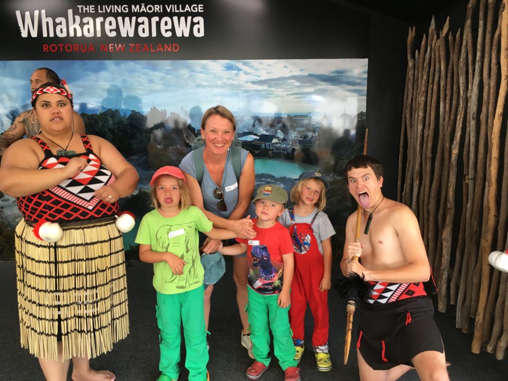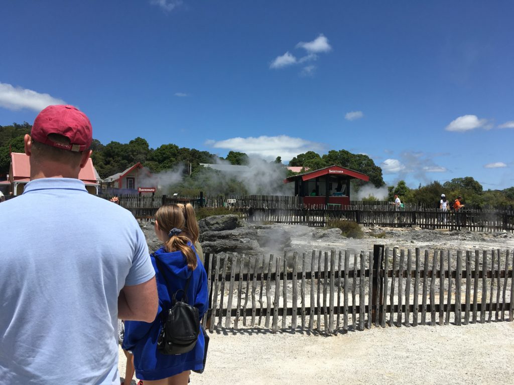 Erneut großer Protest als wir uns dem blubbernden Dorf (in der Stadt) nähern, es ist warm und eine deutliche faule Eier-Note liegt in der Luft. Die Jungs sind “not amused” und Ingo versucht sie irgendwie zu überzeugen, das Dorf zu betreten, während die Damen-Fraktion sich schon mal der Besuchergruppe anschließt, die von einer ortsansässigen Maori durch den Ort geführt wird. Carlotta gefällt am besten, als sie erzählt, dass eine Frau eines Morgens durch einen Krach geweckt wird, in ihre Küche gehen möchte und feststellen muss, dass da jetzt ein Loch ist, aus dem es nach Schwefel stinkt. Es ist tatsächlich bizarr, überall qualmt oder sprudelt es aus der Erde und der Gedanke, dass sich der Boden vor einem auftut und verschlingt, ist nicht so absurd. Die Maori ziehen jedenfalls den maximalen Nutzen daraus: Es gibt kommunale Schwefelöfen zum Essen kochen, Heiße Quellen werden zum Gemüse kochen benutzt und öffentliche Badewannen werden stündlich automatisch mit heißem Wasser neu befüllt. Verrückt. Zum Abschluss noch eine musikalische Darbietung mit anschließendem Fototermin. An sich sehr schön und interessant, wenn da nicht unser Likud-Block gewesen wäre…