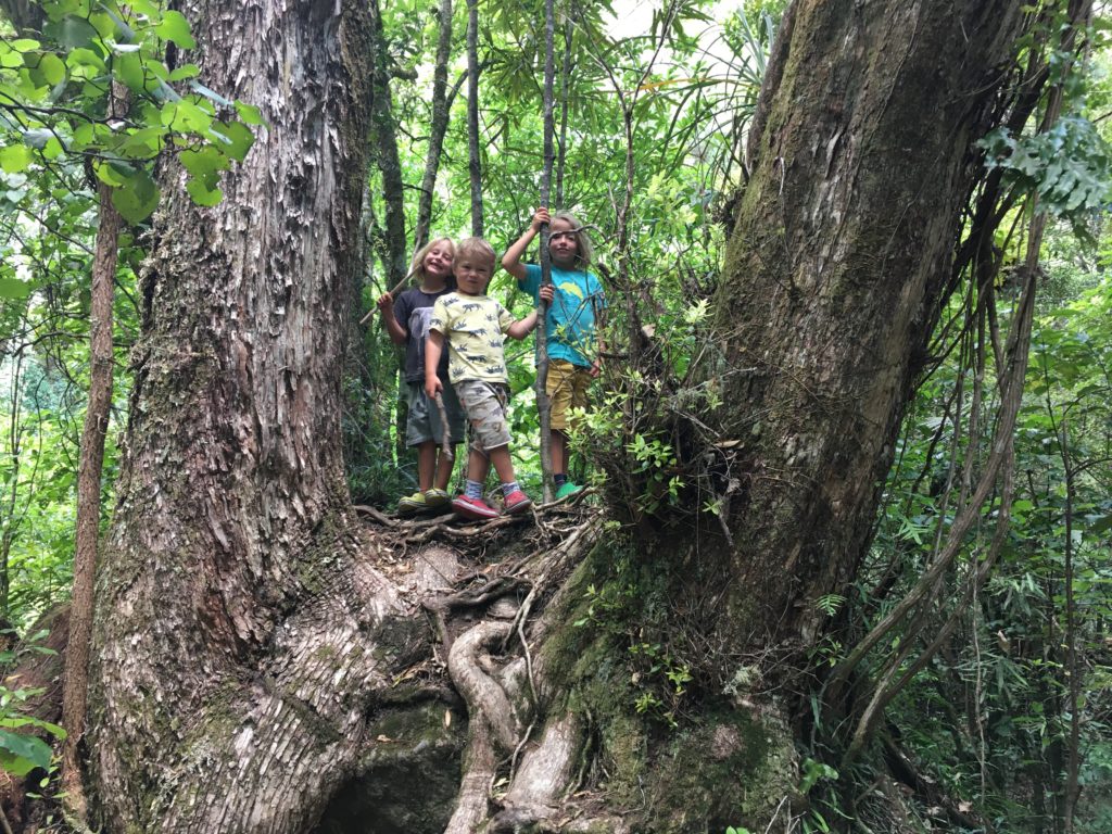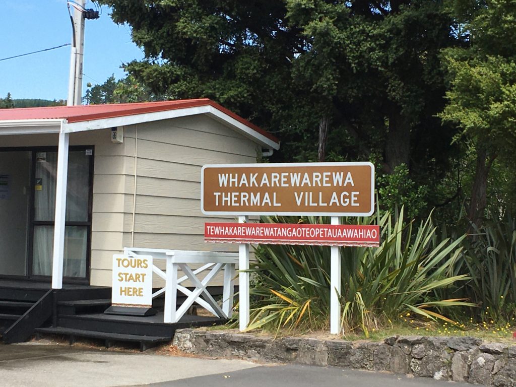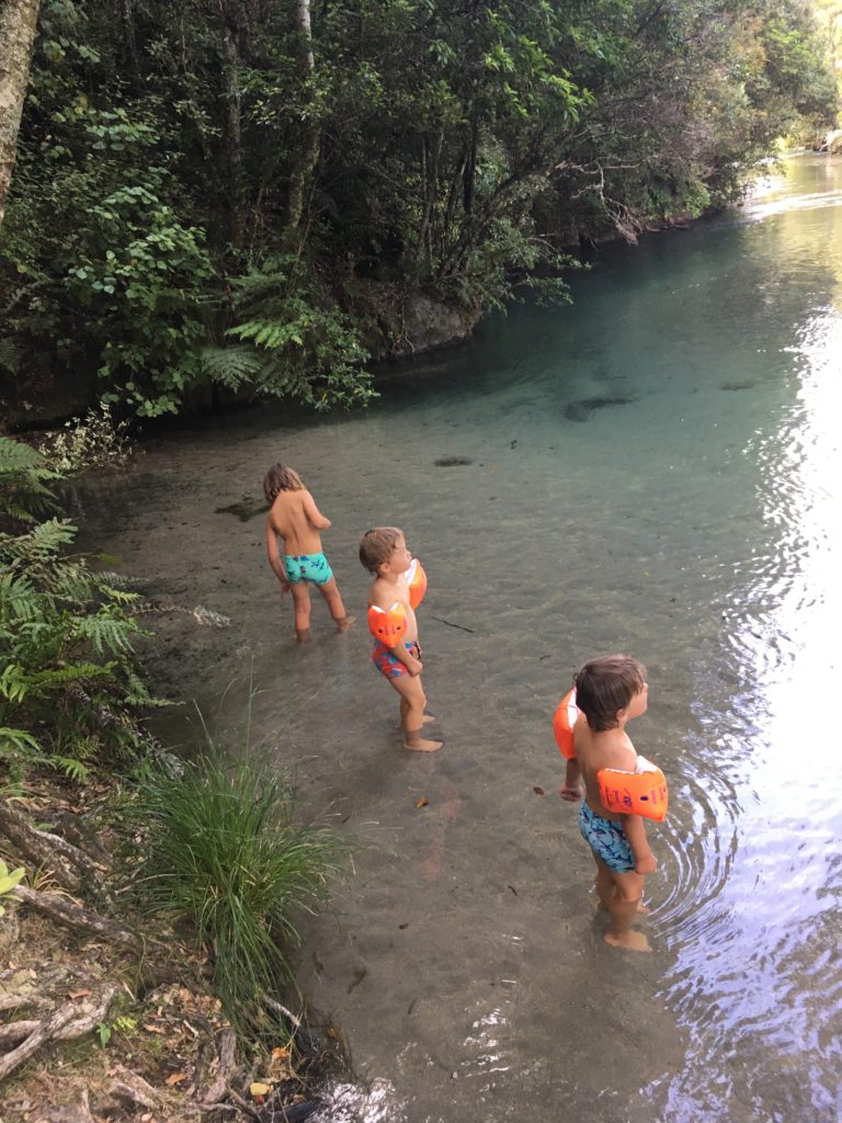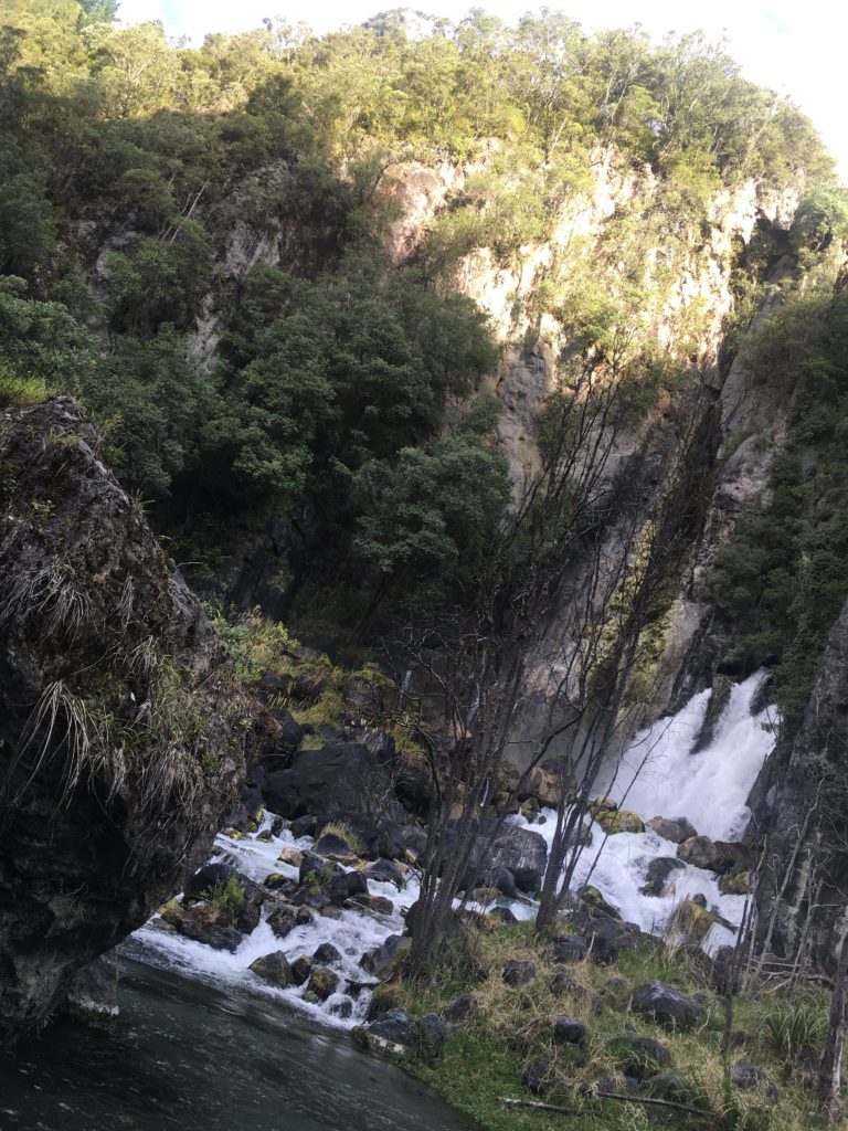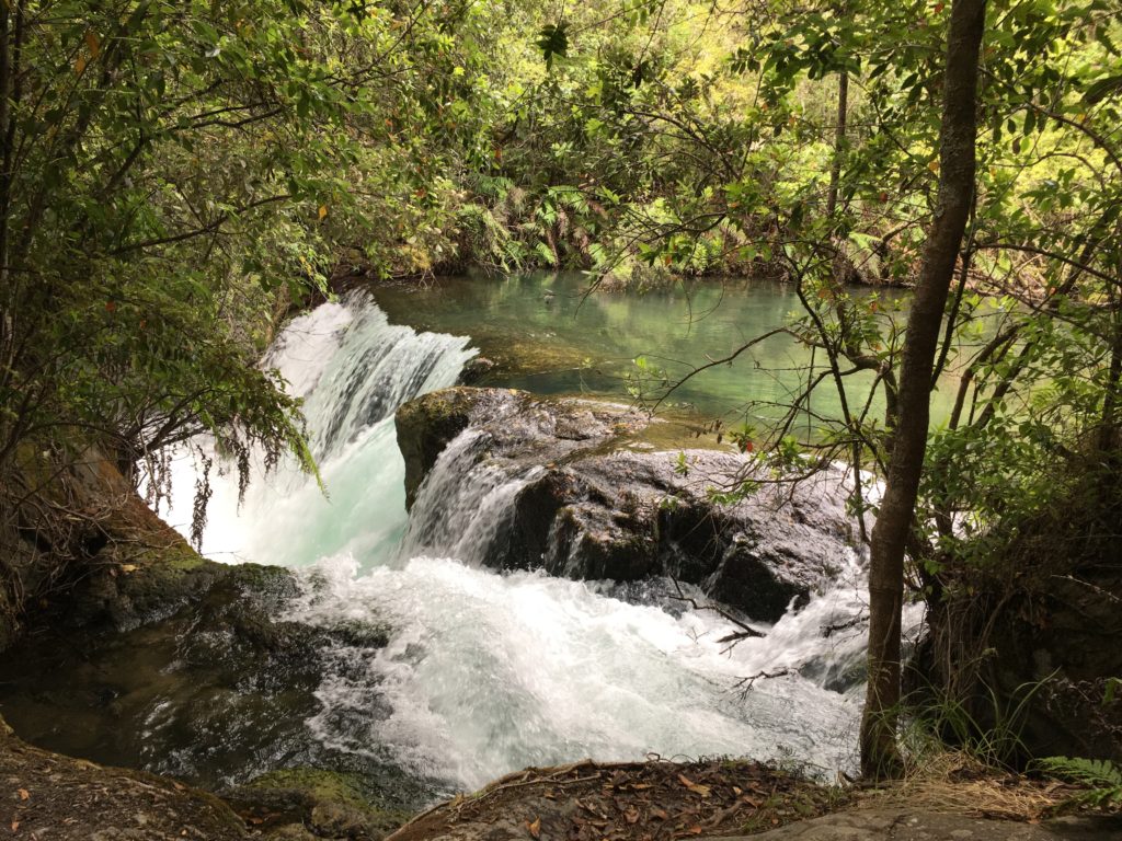 Hoffentlich kann ich mich noch an alles erinnern, was in der Zwischenzeit so passiert ist. Dem Gestank und den Touristen entflohen, verschlägt es uns zunächst wieder etwas ins Hinterland, wo die Wohnmobildichte massiv abnimmt. In Kawerau entdecken wir ein öffentliches, kostenloses Thermalschwimmbad mit Wasserspielplatz, was nach zwei Tagen “Seepause” schon wieder die Kinderherzen höherschlagen lässt. Ich passe erkältungsbedingt. Außerdem entschließen wir uns, mal wieder eine Wanderung zu Wasserfällen zu machen. Um dorthin zu gelangen, muss bei der örtlichen Touristeninformation eine Gebühr von 5 Dollar bezahlt werden, damit wir die privaten, auf Maori-Gebiet liegenden Straßen benutzen dürfen. Spannend, das ist neu.
