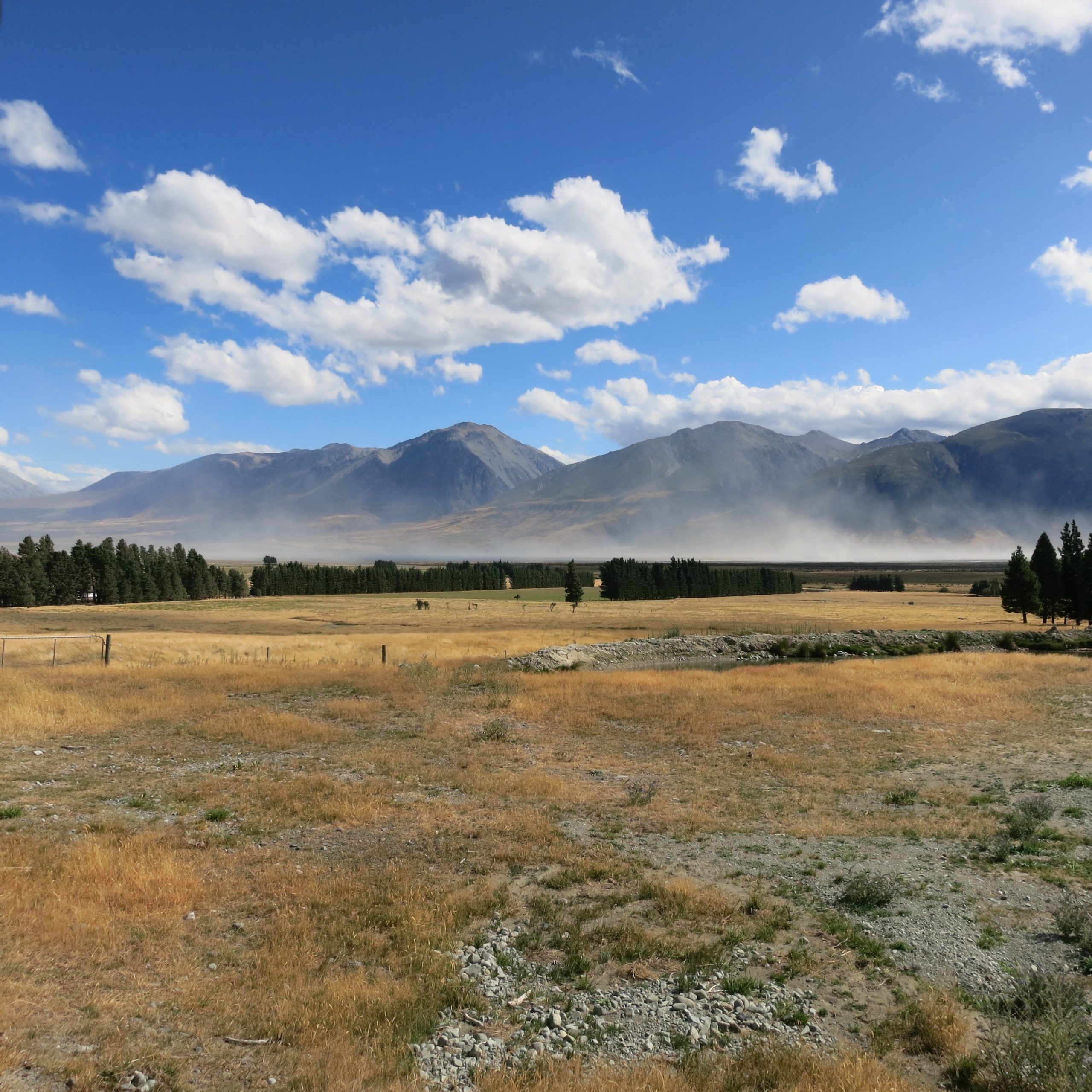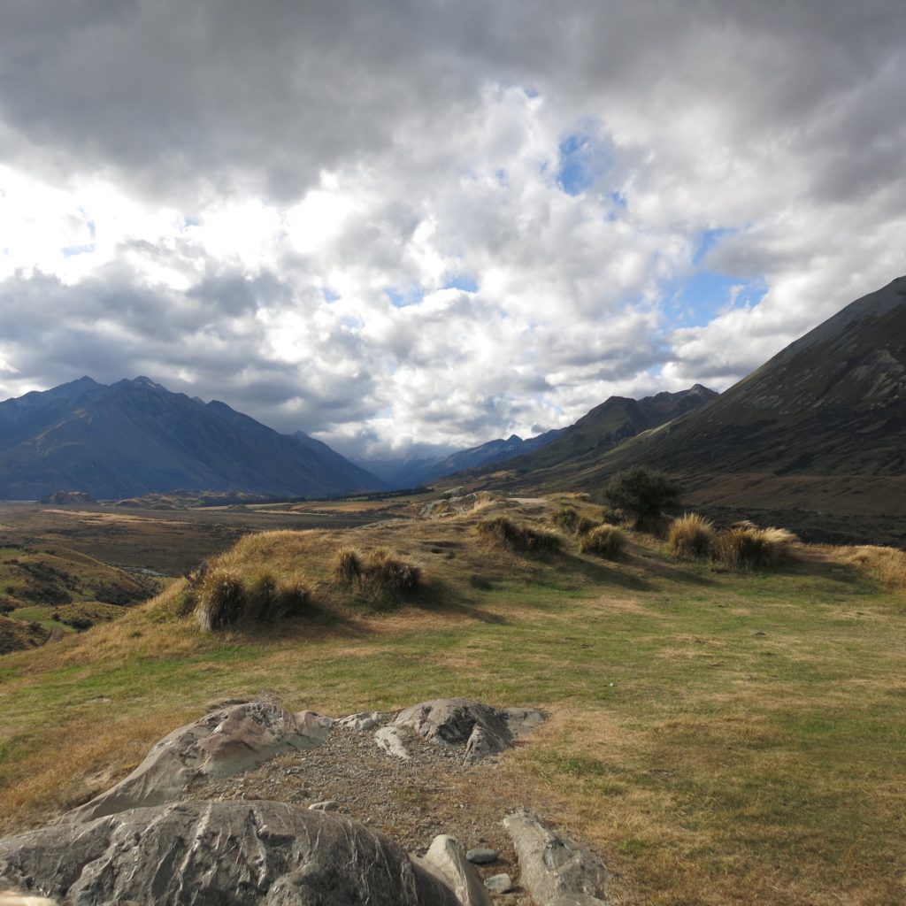 Nach einer dreiviertel Stunde etwa sind wir am Ende der dirt road angekommen, bei der Erewhon Station (dem belesenen Anglisten mag dies irgendwie bekannt vorkommen), wir fahren noch in Stückchen weiter, bevor wir angesichts der immer dichteren Wolken den Rückweg antreten.