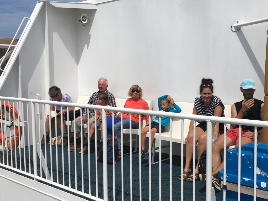 Das Ganze bekommen wir gleich zweimal gezeigt. Oma, Mädels, alle sind wir entzückt. Auf dem Weg zurück gleich das nächste Spektakel: Eine große Gruppe Delfine begleitet uns, sie springen aus dem Wasser, alleine zu mehreren, Carlotta ruft nur noch “Ui, ui!” und ist begeistert.