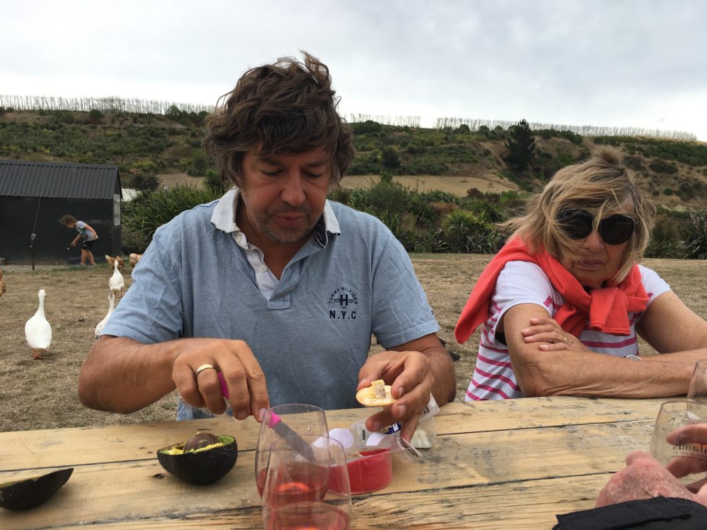 Nächster Stopp ist in Kaikoura: Auf dem Weg dorthin stoppen wir an einem der größten Weingüter, probieren neuseeländischen Wein, lassen uns ein paar Picknicksachen zusammenstellen und machen uns auf eine Rundfahrt durch das riesige Weingut. Leider ist es an diese Tag extrem windig, so dass das mit dem Picknick nicht ganz so idyllisch wird wie gedacht. Schließlich finden wir einen wunderbaren, windgeschützen Picknickplatz in einer kleinen Senke neben einem Butterfly-Garden (bei dem bei dem Wind aber auch nichts fliegt) und einem Hühnerstall, aus dem die Kleine Nachtmusik ertönt. Das müssen beglückte Hühner sein… Wein, Käse und Cracker-Knabberzeugs werden ausgepackt, der Rosé wird noch einmal getestet und für trinkbar befunden (die neuseeländischen Weine überzeugen uns bis dato leider nicht wirklich, dafür sind wir einfach zu viele gute spanische, italienische, österreichische etc. Weine von zuhause gewöhnt, dass so ein hiesiger Merlot oder Pinot Noir einfach schlechte Karten hat).