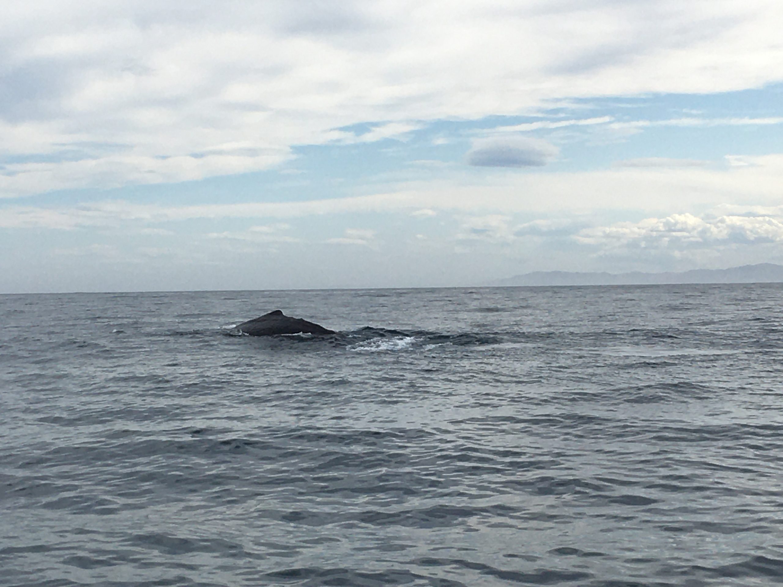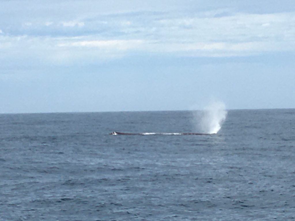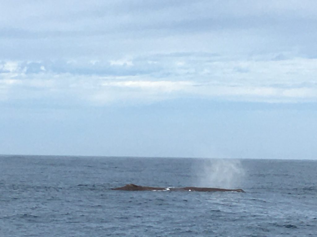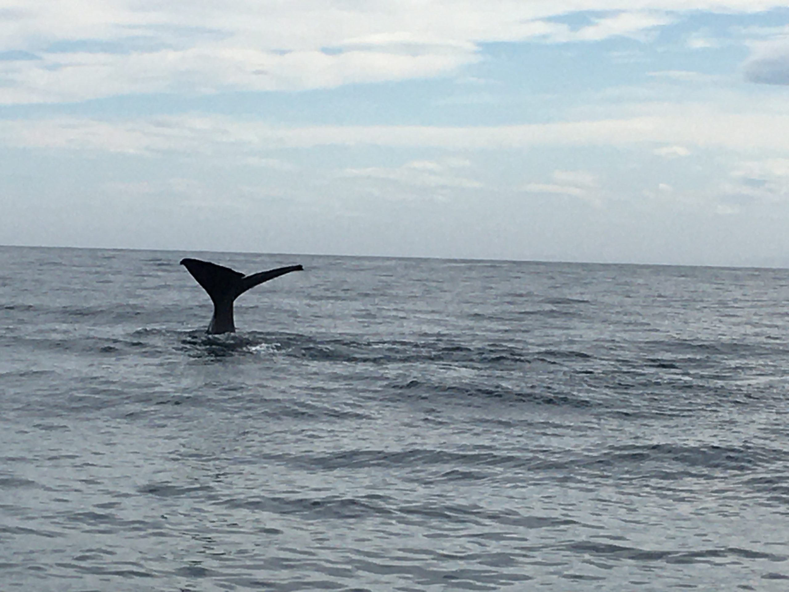 Am zweiten Tag gibt es einen Damenausflug, Highlight Nr 2: Wir machen eine whale watching-Bootstour. Mit dem Boot fahren wir ein Stück raus zu einem tiefen Unterwassergraben, wo sich die Wale gerne tummeln, wie uns die Crew an Bord erklärt. Natalie ist ob der etwas wackeligen Fahrt ein wenig flau und sie st froh, als wir endlich anhalten, um nach dem Wal Ausschau zu halten. Ein Crew-Mitglied hält eine Art “Unterwasserohr” ins Meer, um zu hören, ob ein Wal da ist und tatsächlich..